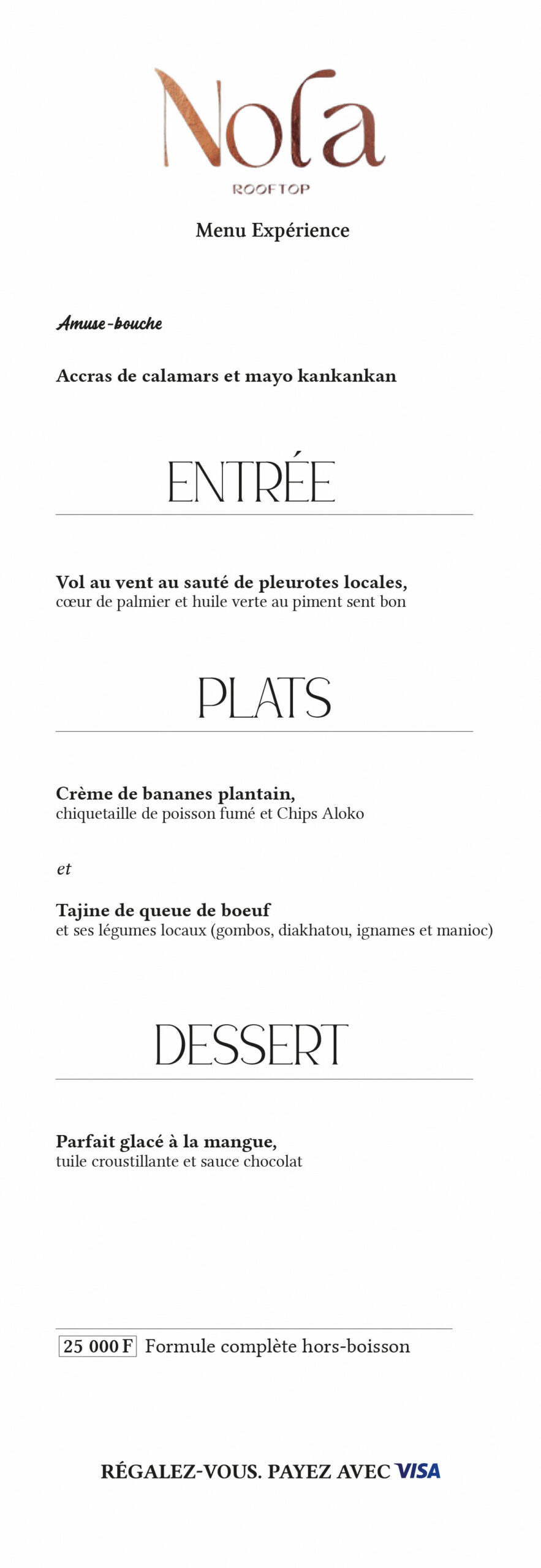 Le menu propose une cuisine internationale soignée, relevée de touches africaines qui apportent caractère et chaleur aux plats. Chaque plat du chef et de son équipe mêle équilibre des saveurs et originalité.